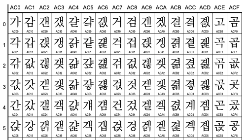 한글은 본래 초성, 중성, 종성의 조합으로 이루어지는 언어이다. 이에 유니코드가 도입되기 전에는 조합형을 사용하자는 의견과 완성형을 사용하자는 의견이 대립하였는데, (https://namu.wiki/w/조합형%20완성형%20논쟁 참고) 결과적으로는 완성형이 채택되었다. 사진과 같이 각각의 완성자에 코드 값(혹은 코드 포인트)을 할당하였는데, 그 개수가 무려 1만을 넘는다고 한다..