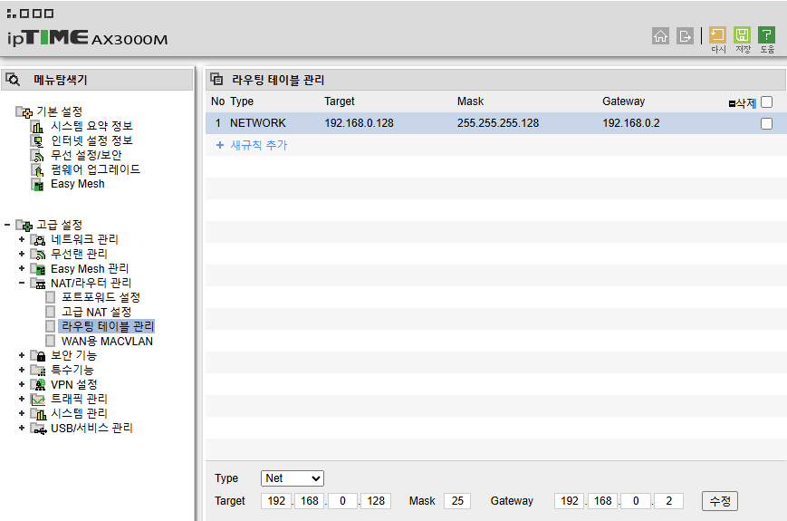 NAT/라우터 관리 > 라우팅 테이블 관리 탭에서 사진과 같이 정적 경로를 추가한다.
