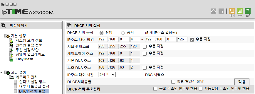 이후 적용을 누르고 우측 상단의 다시 버튼을 눌러 공유기를 재부팅한다. DHCP 풀을 초기화하기 위함이다.