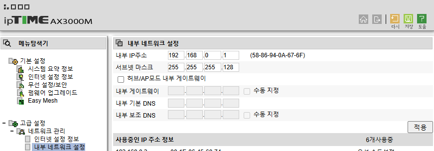 ipTIME GUI에 접속하여 관리도구 > 고급 설정 > 네트워크 관리 > 내부 네트워크 설정 탭에 들어간다.