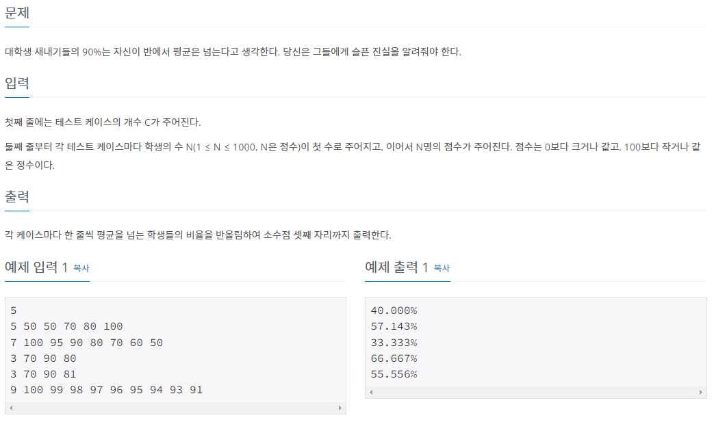문제 자체는 어렵지 않지만 출력 형식이 소수점을 포함한 퍼센테이지로 지정되어 있다.