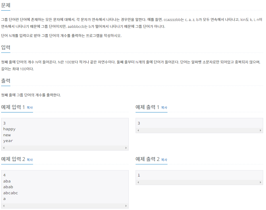이때 그 차이가 1이라면 a는 서로 붙어 있다는 뜻이 되지만 1보다 크다면 그렇지 않다는 뜻이므로 그룹 단어의 조건에 위배된다. 이를 검사하면 된다.