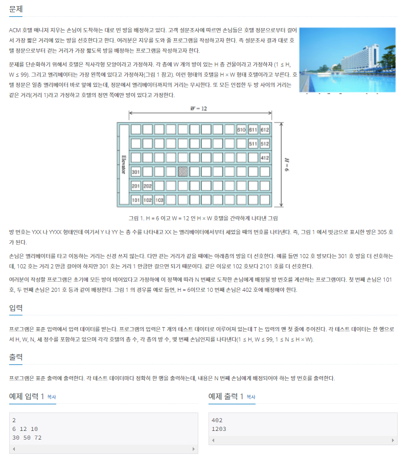 문제를 읽어보면 "102 호보다 2101 호를 더 선호한다" 라고 적혀있는데 이는 사진에서 방이 배정되는 방향이 오른쪽이 아닌 위쪽임을 의미한다.