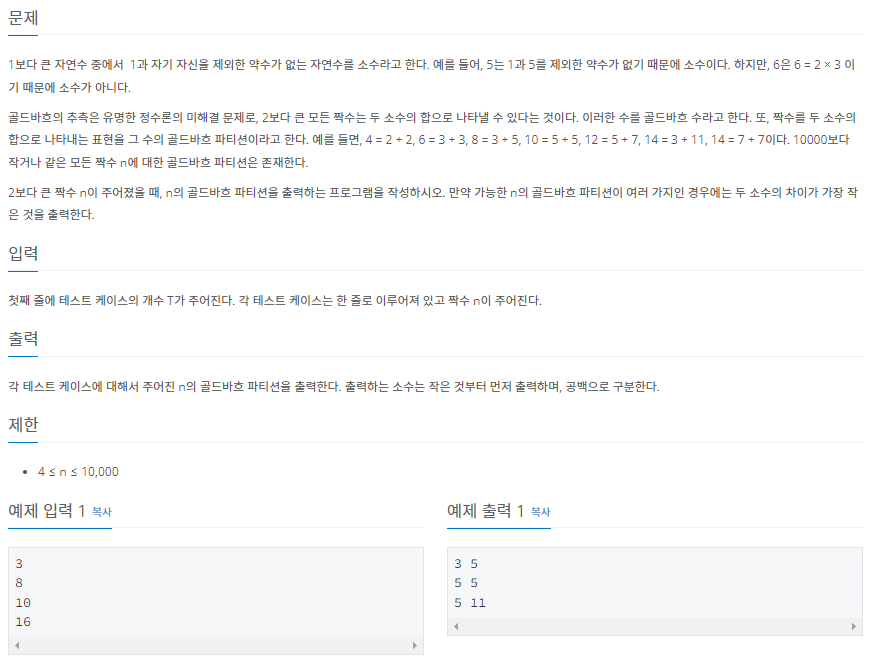 짝수를 두 소수의 합으로 나타내되 차이가 가장 작은 것으로 출력하라고 한다. 상당히 어려운 조건처럼 보이지만 이는 사실 힌트에 가깝다.