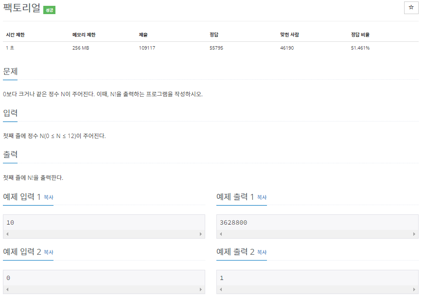 n!은 1부터 n까지의 자연수를 모두 곱한 수를 의미한다. 참고로 0!은 1이다.