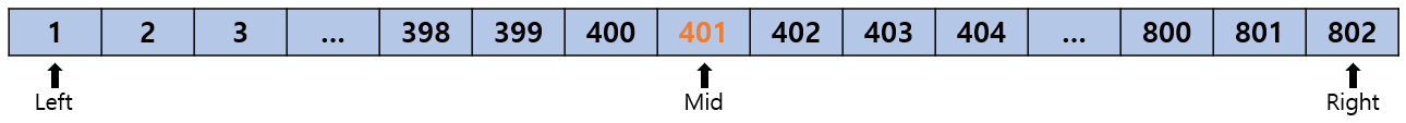 그래서 1과 802를 각각 Left, Right로 잡으면 Mid는 (1 + 802) // 2 = 401이 되는데,