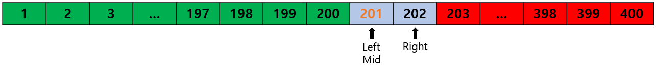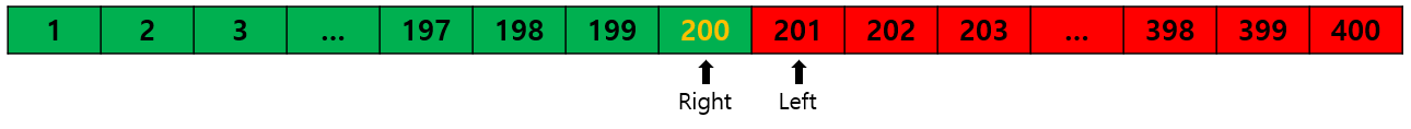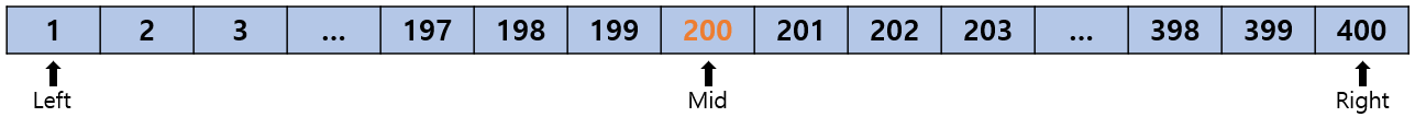이제 401 이상의 값들은 더 이상 정답이 될 수 없으므로 Right는 Mid - 1인 400이 되었다.