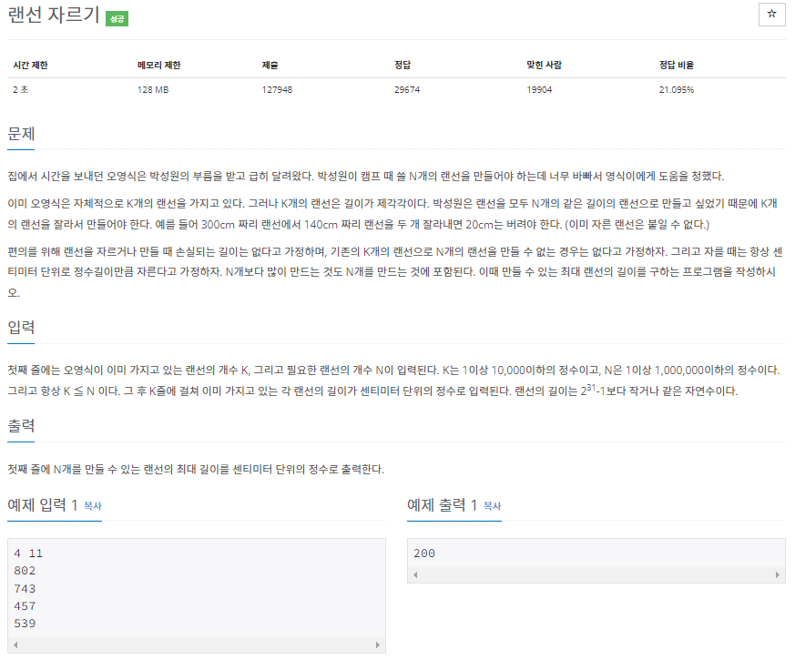 그러면 차례대로 2개, 1개, 1개, 1개의 랜선을 얻을 수 있으므로 총 7개의 랜선을 얻을 수 있는데, 이것은 N = 11개보다 작은 값이다. (참고로 몫 연산으로 구할 수 있다)
