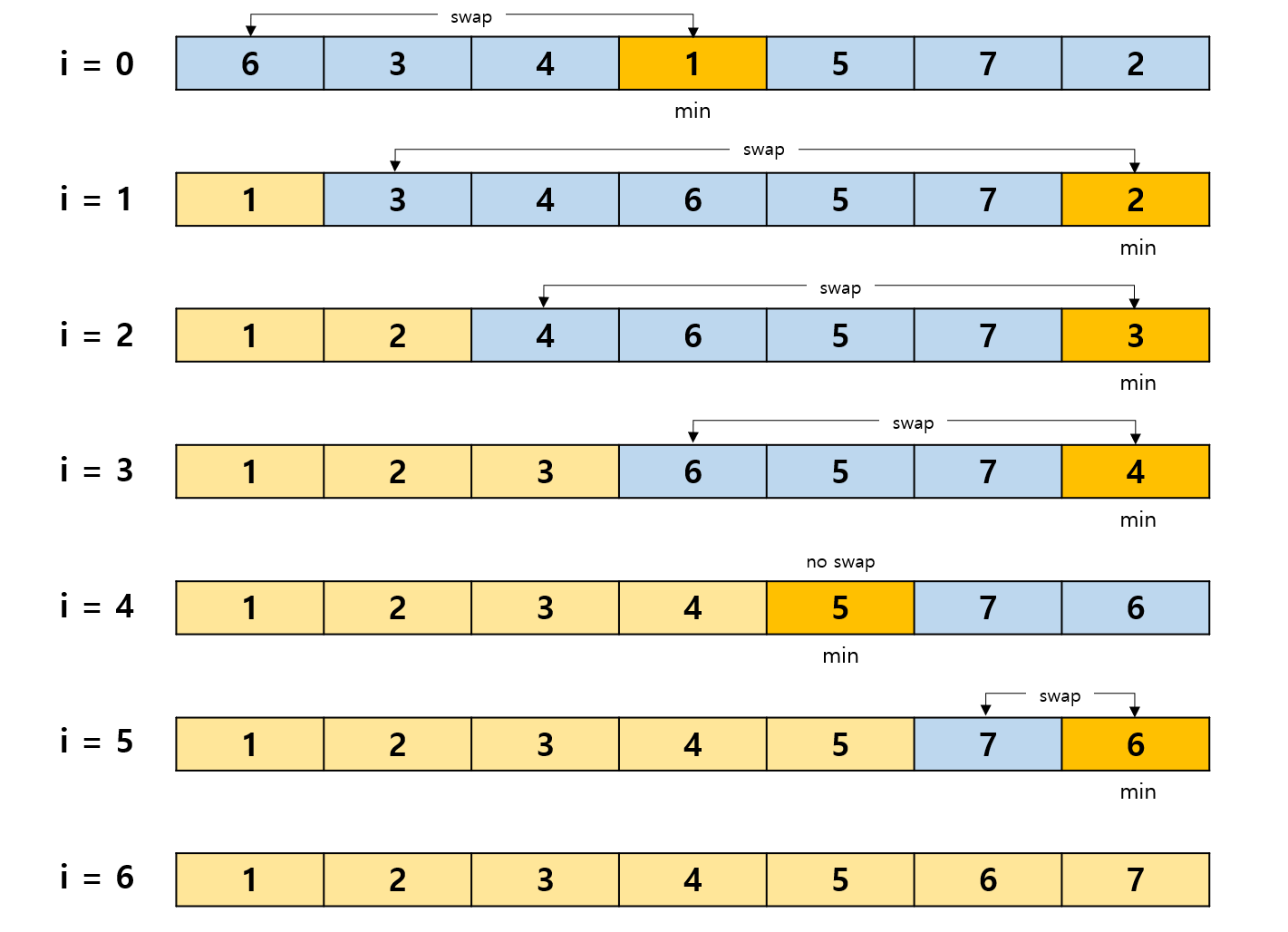 위 그림처럼 최솟값을 선택하고, 이를 i번째 위치로 이동시키는 작업을 반복한다.