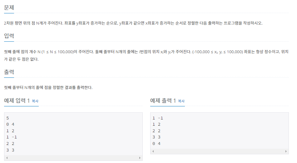 이 문제는 11650번 문제와 동일한 오름차순 정렬이지만 x가 아닌 y를 우선시하고 있다.